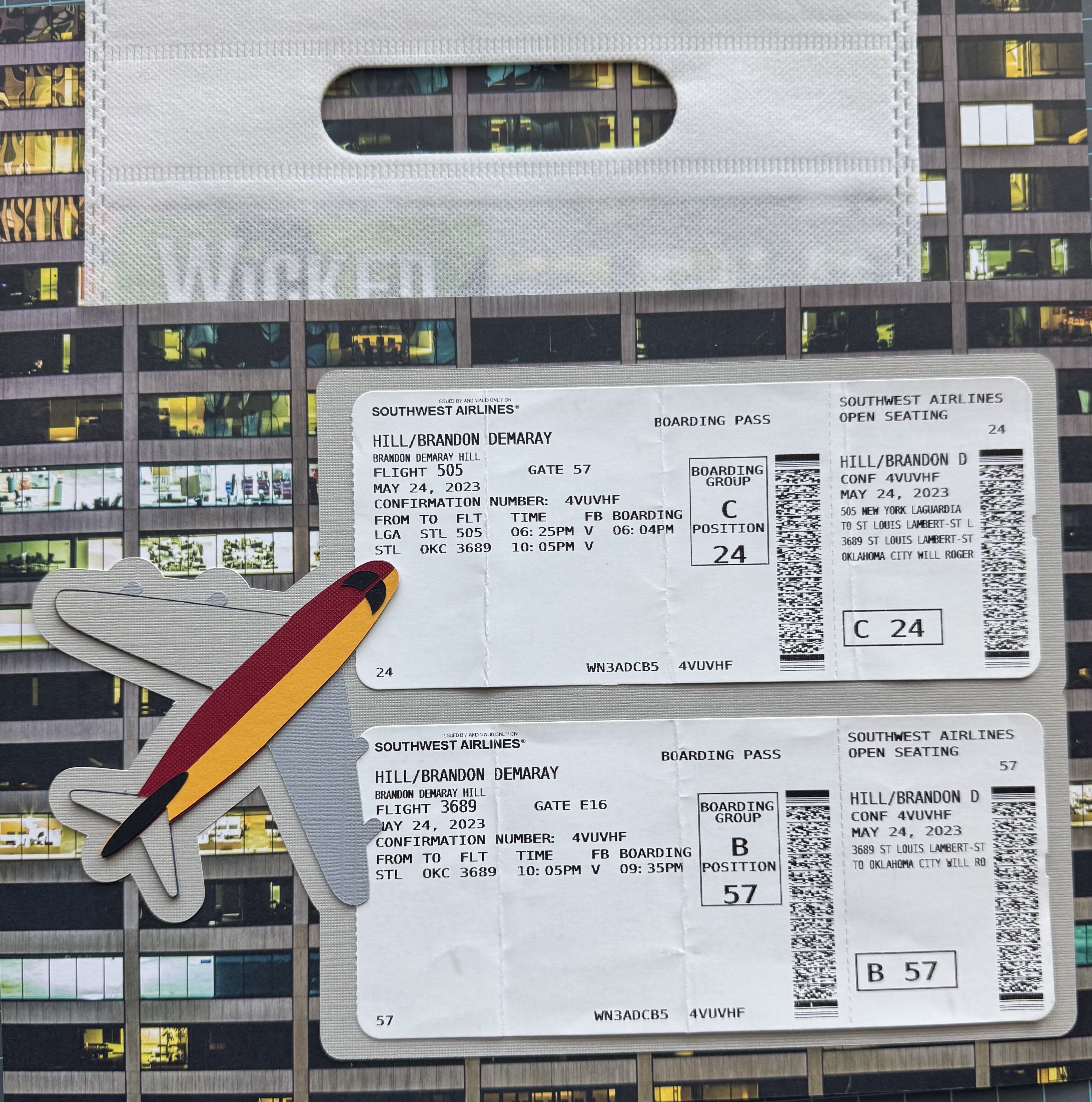 For this page, I used Cricut Design Space to create a custom airplane design and matting for our return tickets. I cut them out using my Cricut Maker, which gave them a polished and professional look. The background paper is from my New York-themed pack, featuring a building design. To add dimension, I carefully slit a line at the window level of the background paper, turning it into an interactive pocket.