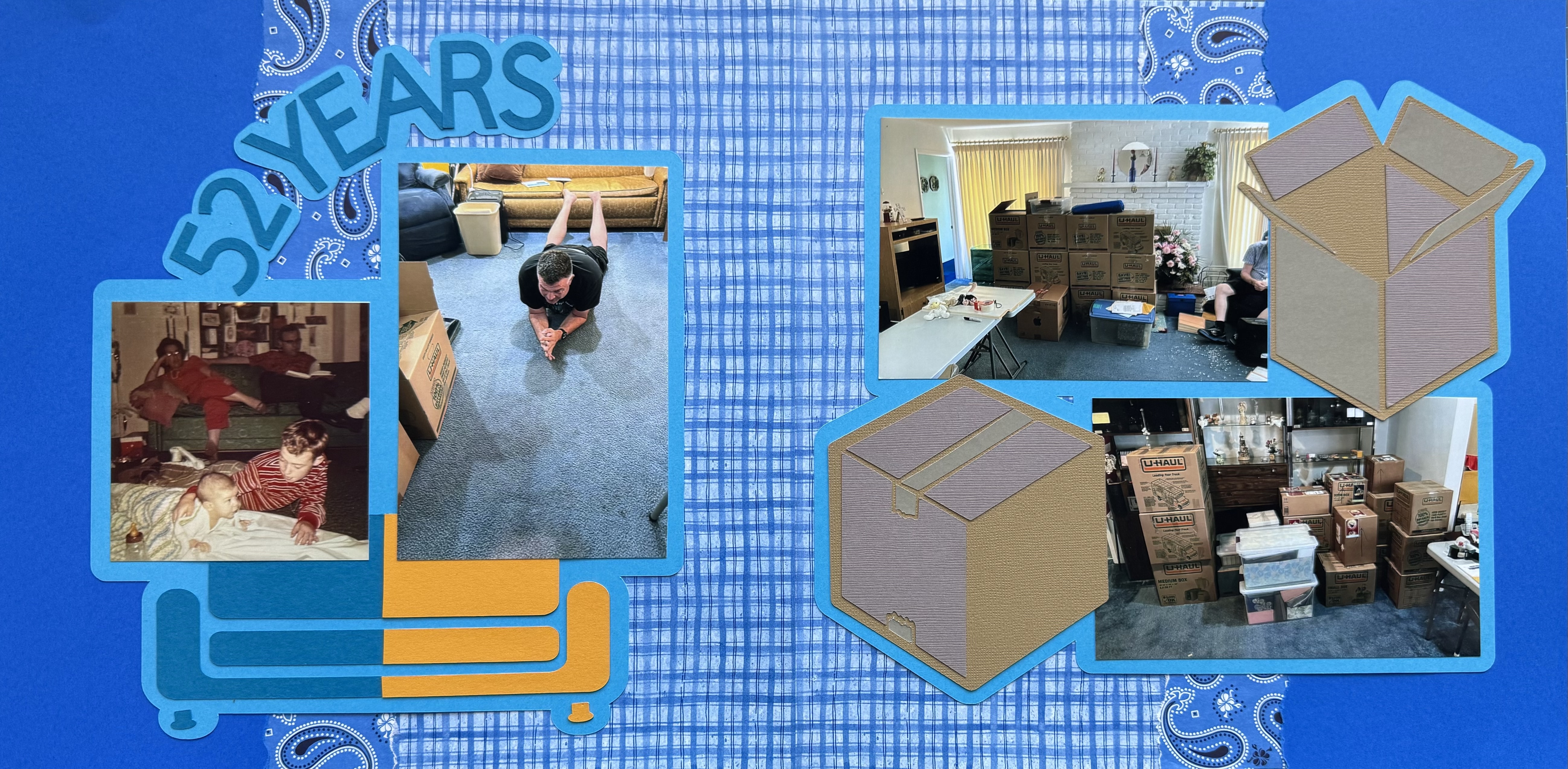 As I worked on this layout in Cricut Design Space, I decided to include a couch graphic beneath the photos, splitting it into half blue and half yellow—symbolizing the transformation of the couch over time. Above these images, I placed the title “52 Years”, marking the time difference between when the two photos were taken in the exact same location.