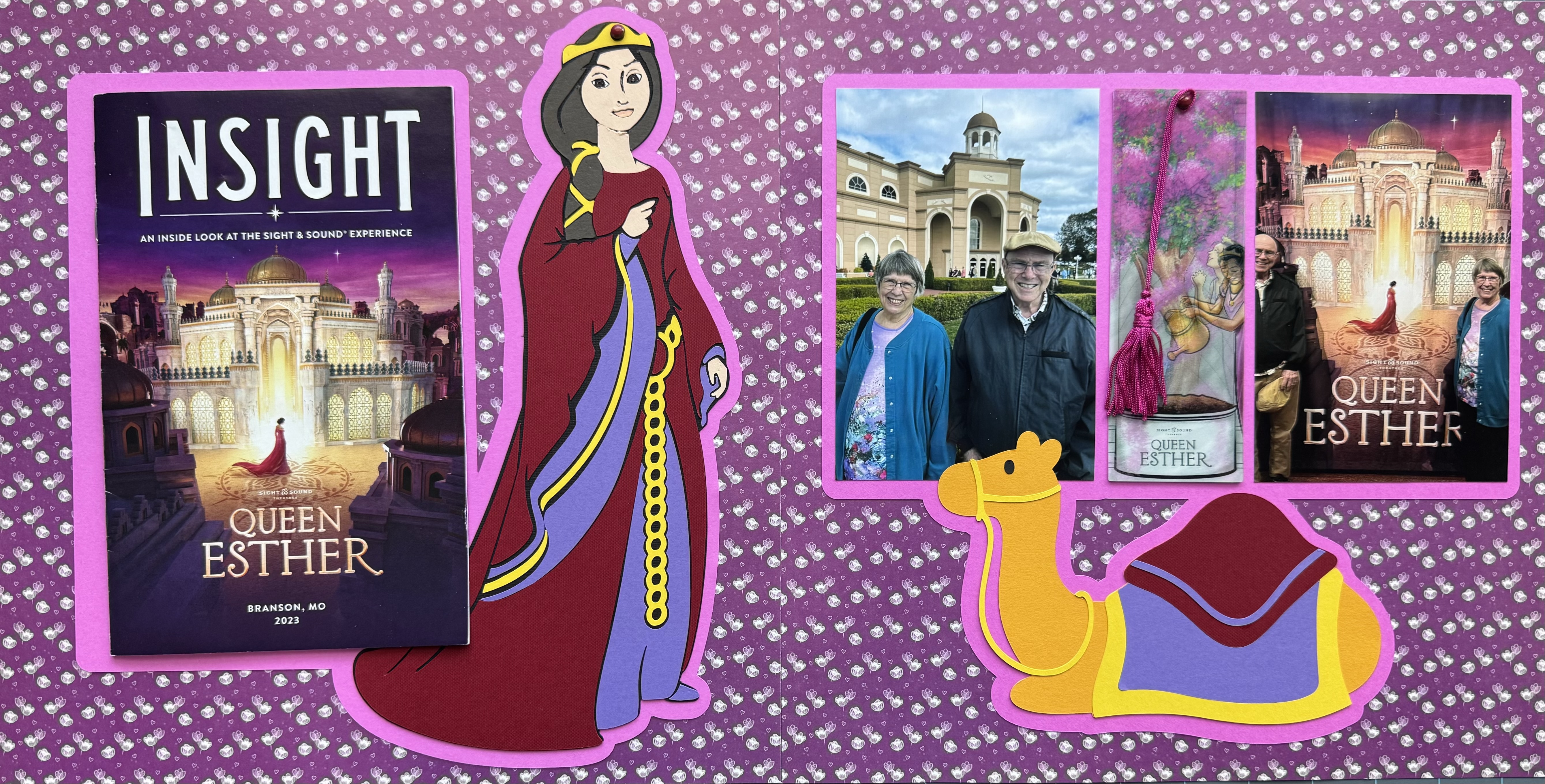 The right-hand page includes photos of my parents outside the theater, along with a picture taken inside next to the promotional poster. In between these, I added a special keepsake bookmark I purchased from the gift shop. To bring cohesion to the design, I included a camel cutout from Cricut Access, ensuring that its colors matched Queen Esther’s outfit, tying the spread together beautifully.