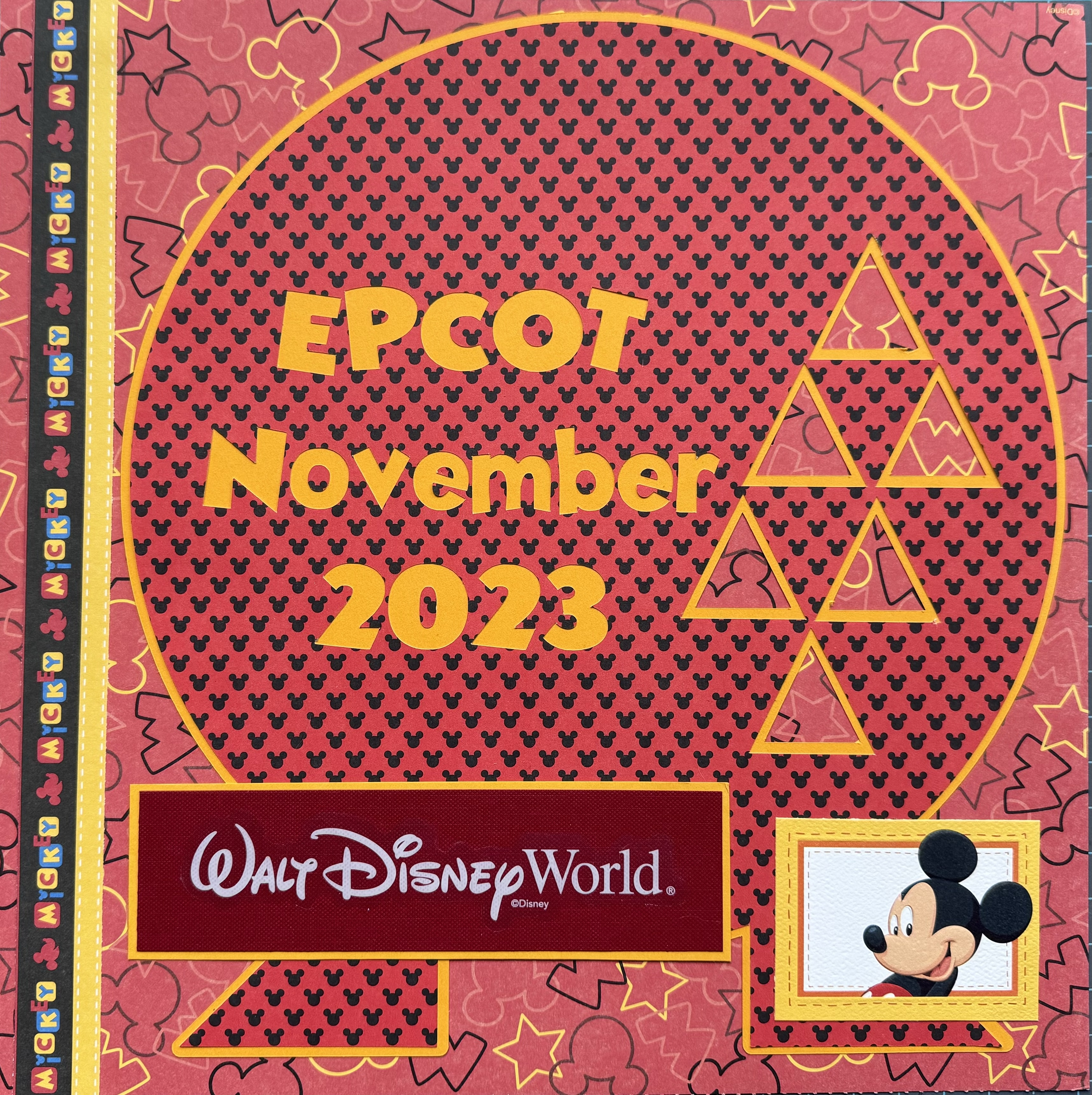 The Spaceship Earth graphic—the iconic geosphere at EPCOT’s entrance—was designed and cut using Cricut Design Space and my Cricut machine. The “Walt Disney World” title is actually a sticker we received in our welcome packet (probably meant for a laptop!), and I knew I had to include it somewhere in the album. The Mickey Mouse accent, border strip, and background cardstock all come from a vintage Disney scrapbooking pack—probably from the 90s—and I love the nostalgic touch they bring.