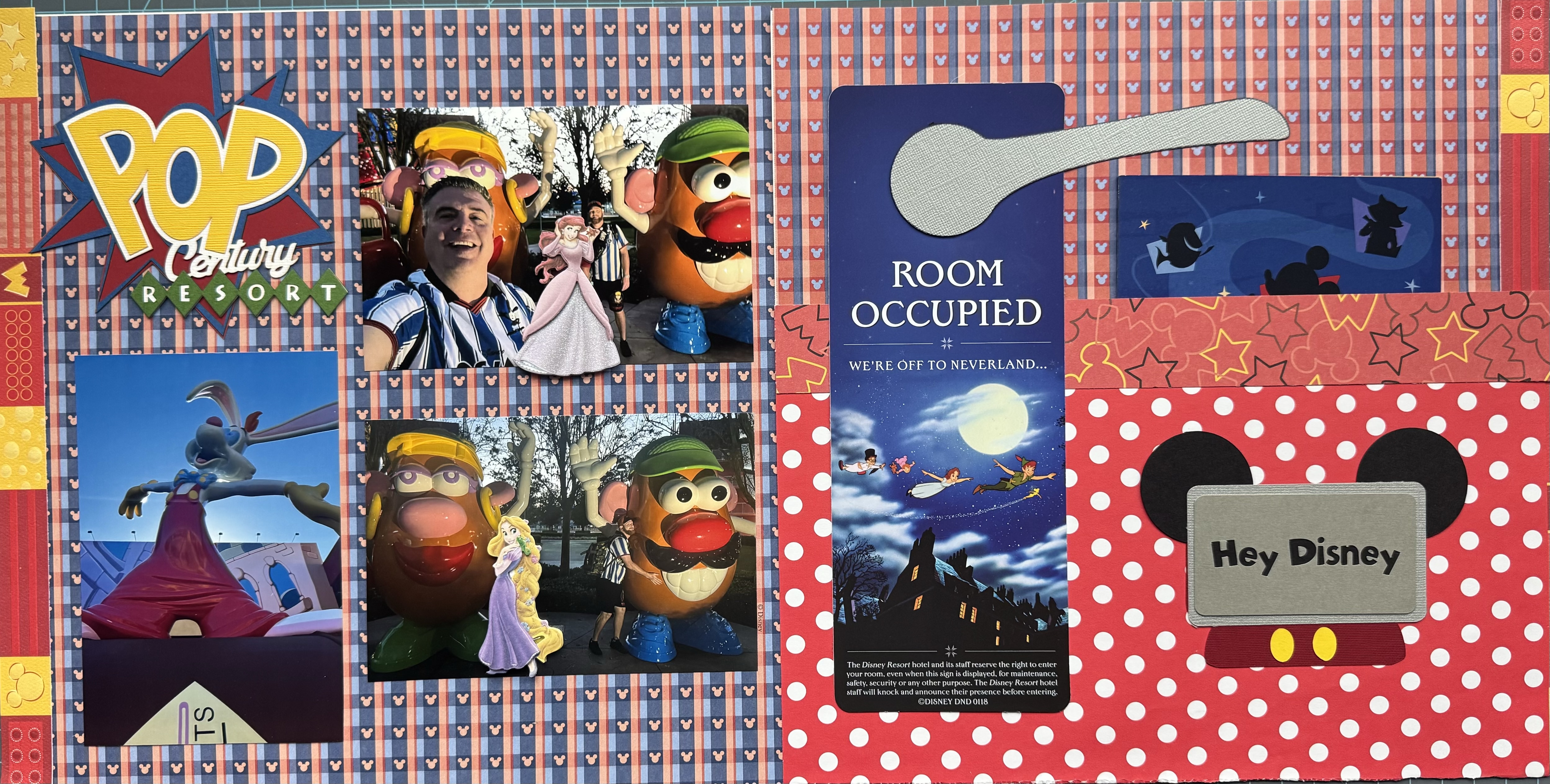 I don’t always make scrapbook pages for the hotels we stay in—but when it’s Disney, it kind of feels like a must. The resorts are so themed and full of personality that they practically beg to be documented. For this trip, we stayed at Pop Century Resort, and I specifically chose it because I wanted to experience the Skyliner. This resort is centrally located, making it super easy to hop on the Skyliner and get to several of the parks. (You’ll see more about that in the next blog post!)