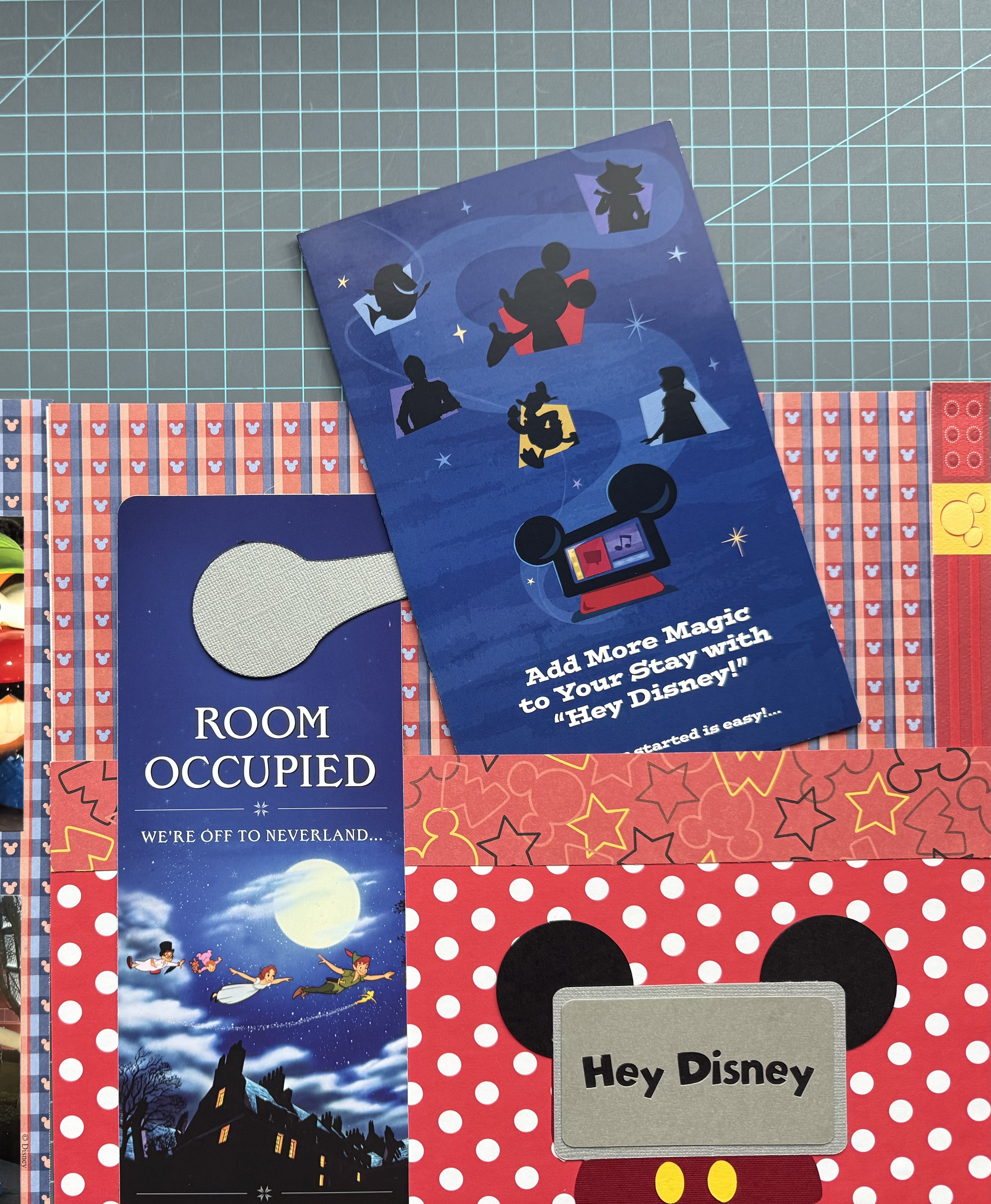 The right-hand page includes the actual “Room Occupied” door tag from our stay. I created a paper door handle with my Cricut to bring the whole concept to life. You might also spot a pocket on this page—yep, it’s functional! If you watch the video below, you’ll see exactly how I constructed it. Inside the pocket is the user guide for the “Hey Disney” Alexa-style assistant, which I decided to include for a very specific reason.