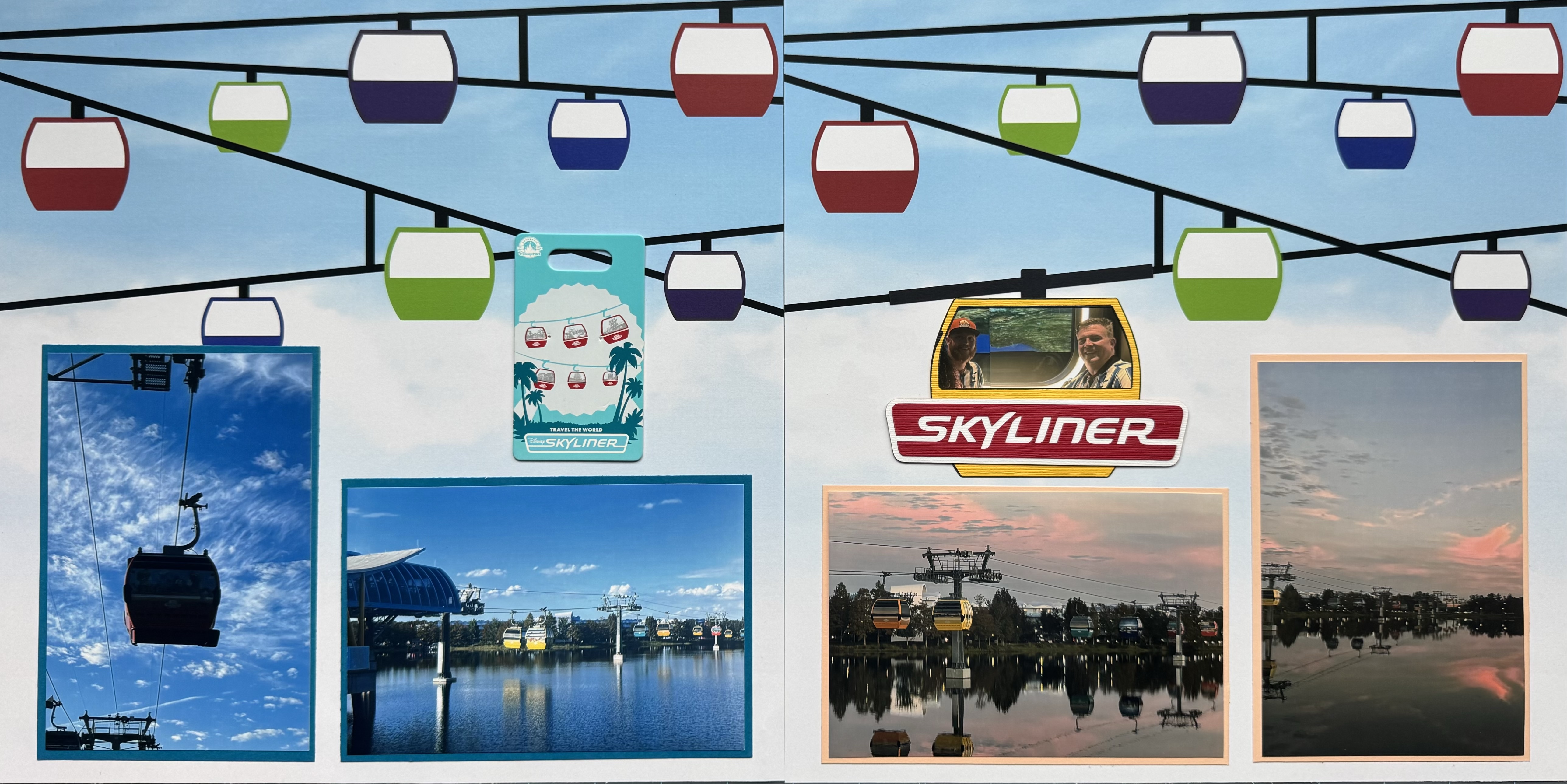 You’ll also see a small tag on the left-hand page—that’s actually the backing from a Skyliner collector pin, which I decided to keep because the design was just too fun to toss. As for the photo matting, I chose blue on the left to reflect the cool tones of the midday ride, and orange-pink on the right to highlight the warm sunrise colors from our early morning adventure.