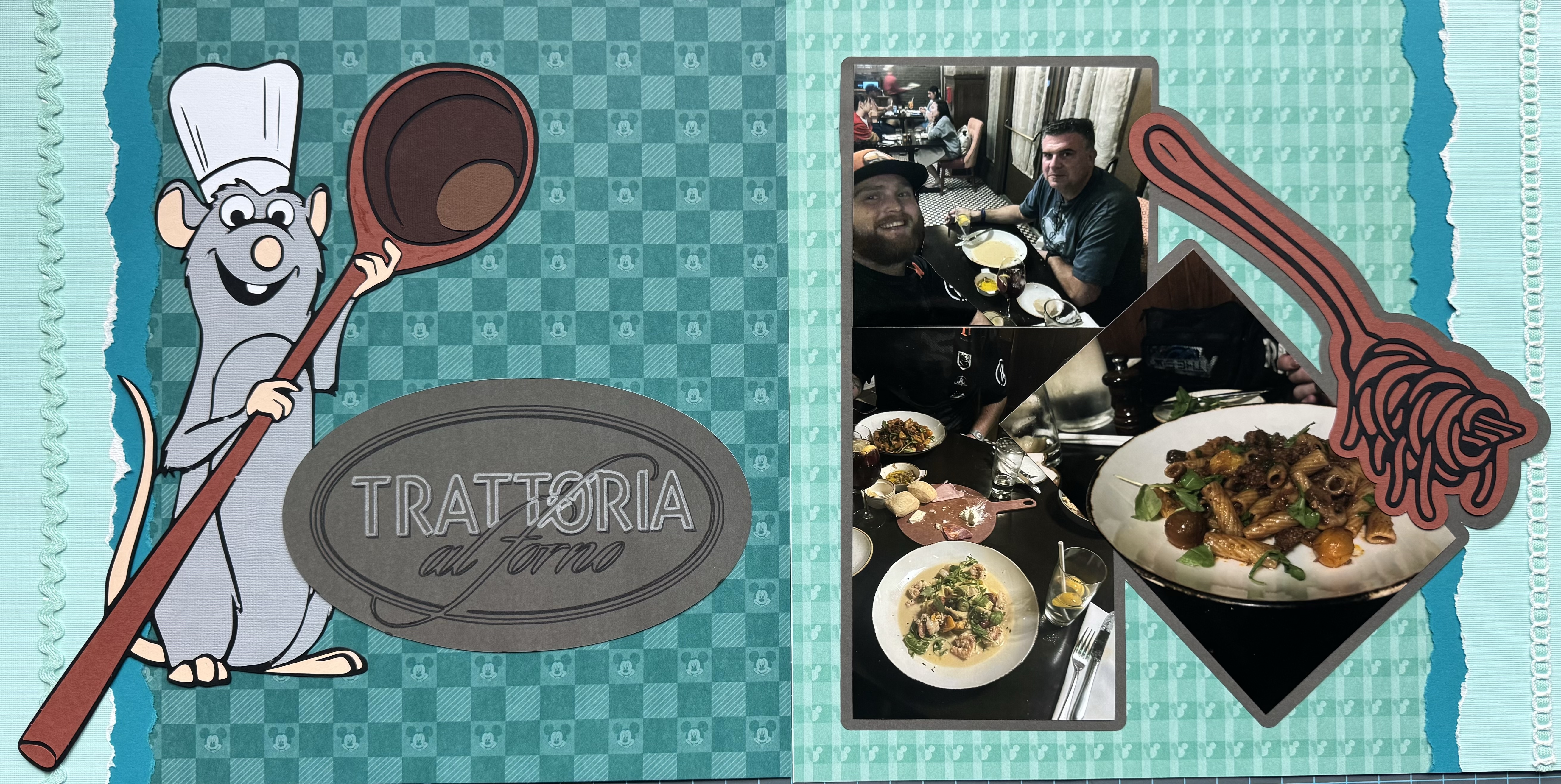 The graphics on this spread were created in Cricut Design Space and then drawn or cut out using my Cricut Maker. The title block was originally going to be cut, but the pieces were too thin and didn’t come out cleanly. So instead, I switched to pens and had the machine draw the title using two different pen colors, and I’m actually really happy with the way it turned out. The Remy character (from Ratatouille) took quite a bit of layering and patience, but I love the final result—it really adds personality to the page.