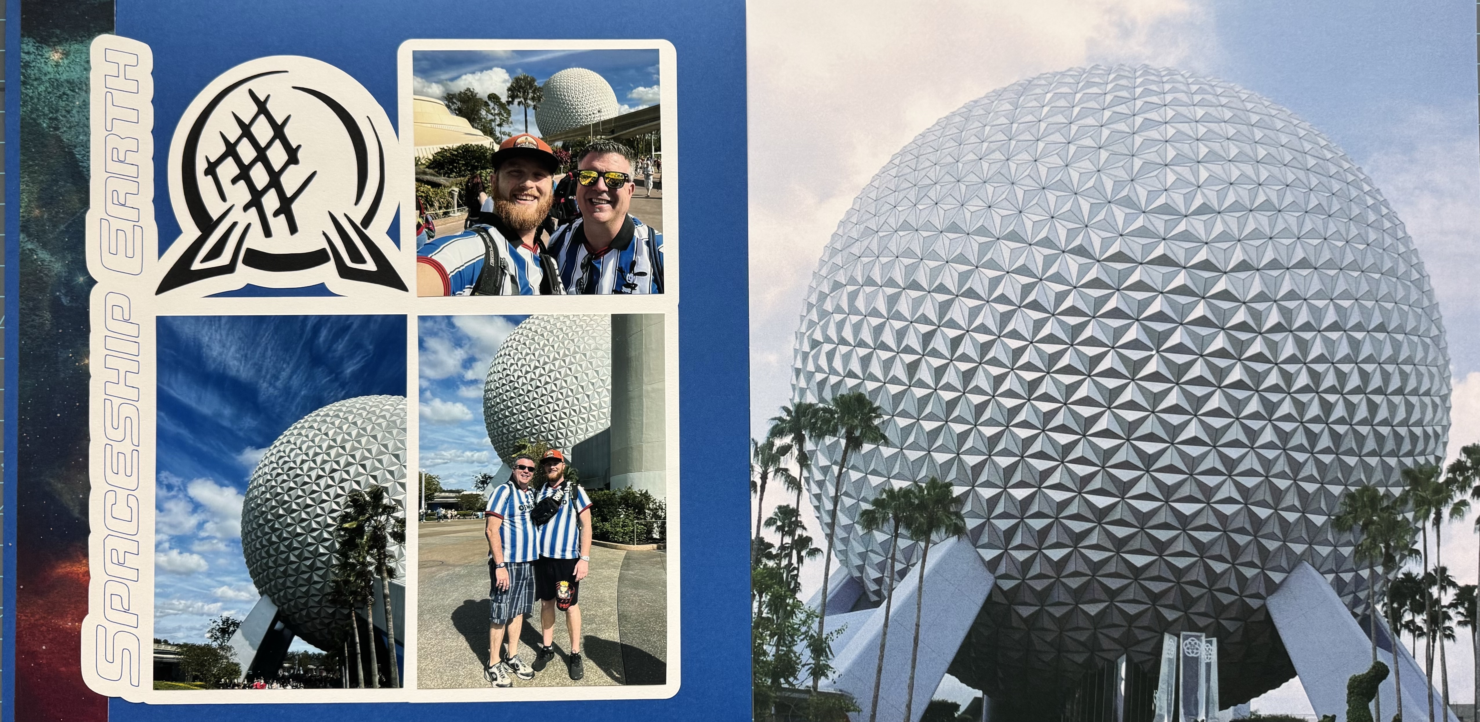 The left-hand page was designed in Cricut Design Space and drawn and cut with my Cricut Maker. The title was done using the pen feature, and the Spaceship Earth graphic is one you might recognize from earlier pages—and you’ll see it again later in the album as a recurring design element. I chose a blue background with white border matting to bring out the cool tones in the photos. I’m especially proud of the bottom left photo, which I captured myself—the clouds in the background add a dramatic, almost surreal quality to the image. To complete the design, I added a strip of space-themed paper along the side to help frame and balance the page.
