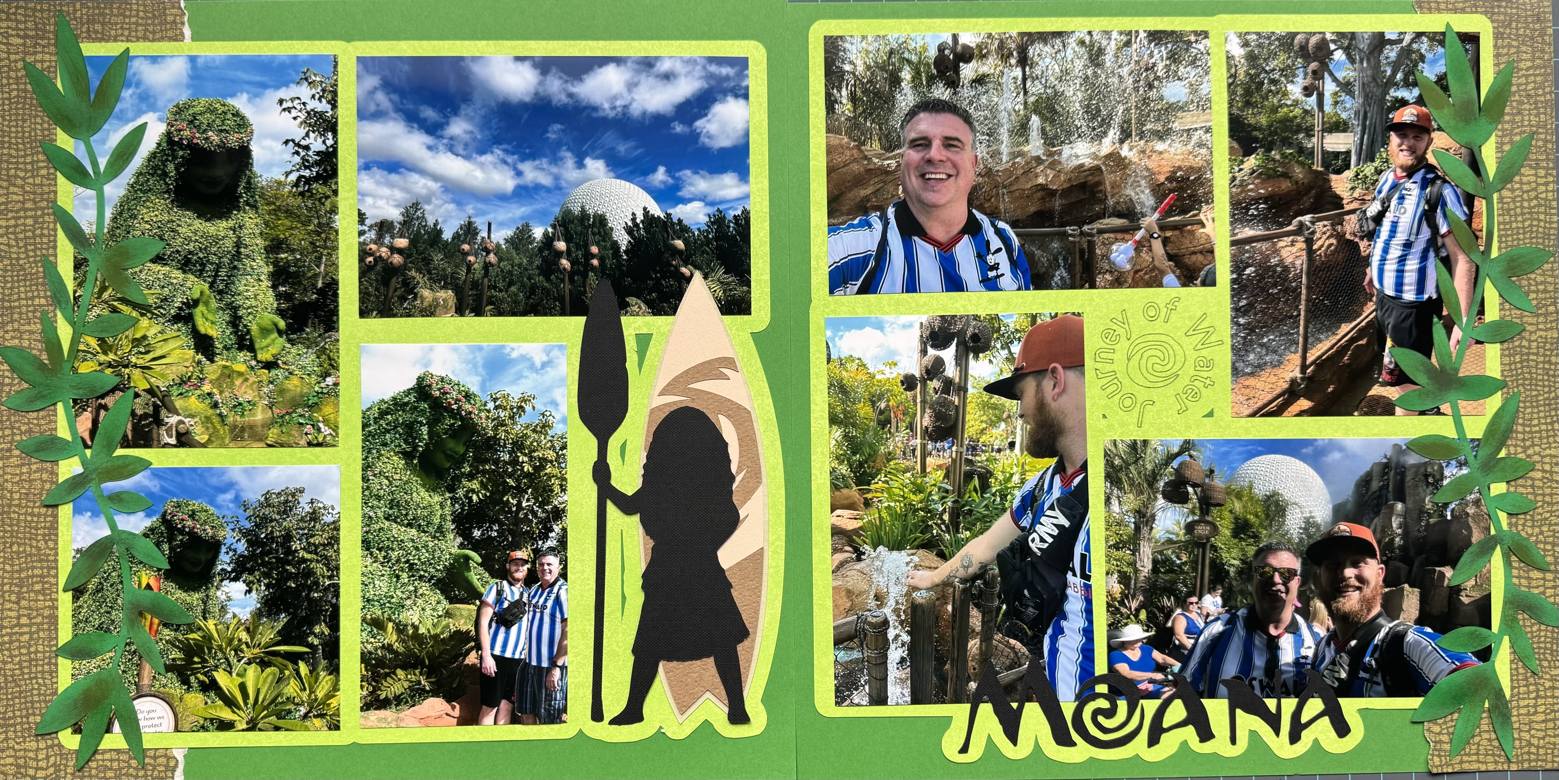 For this spread, I leaned into the lush greens of nature, choosing a deep green background paired with lighter green matting to reflect the vibrant plant life that surrounds the attraction. The entire layout was designed in Cricut Design Space and then cut and drawn using my Cricut Maker. The Moana cutouts were also pulled from Cricut’s library, and the Journey of Water logo was sourced online and drawn with the pen feature for a clean, custom look.