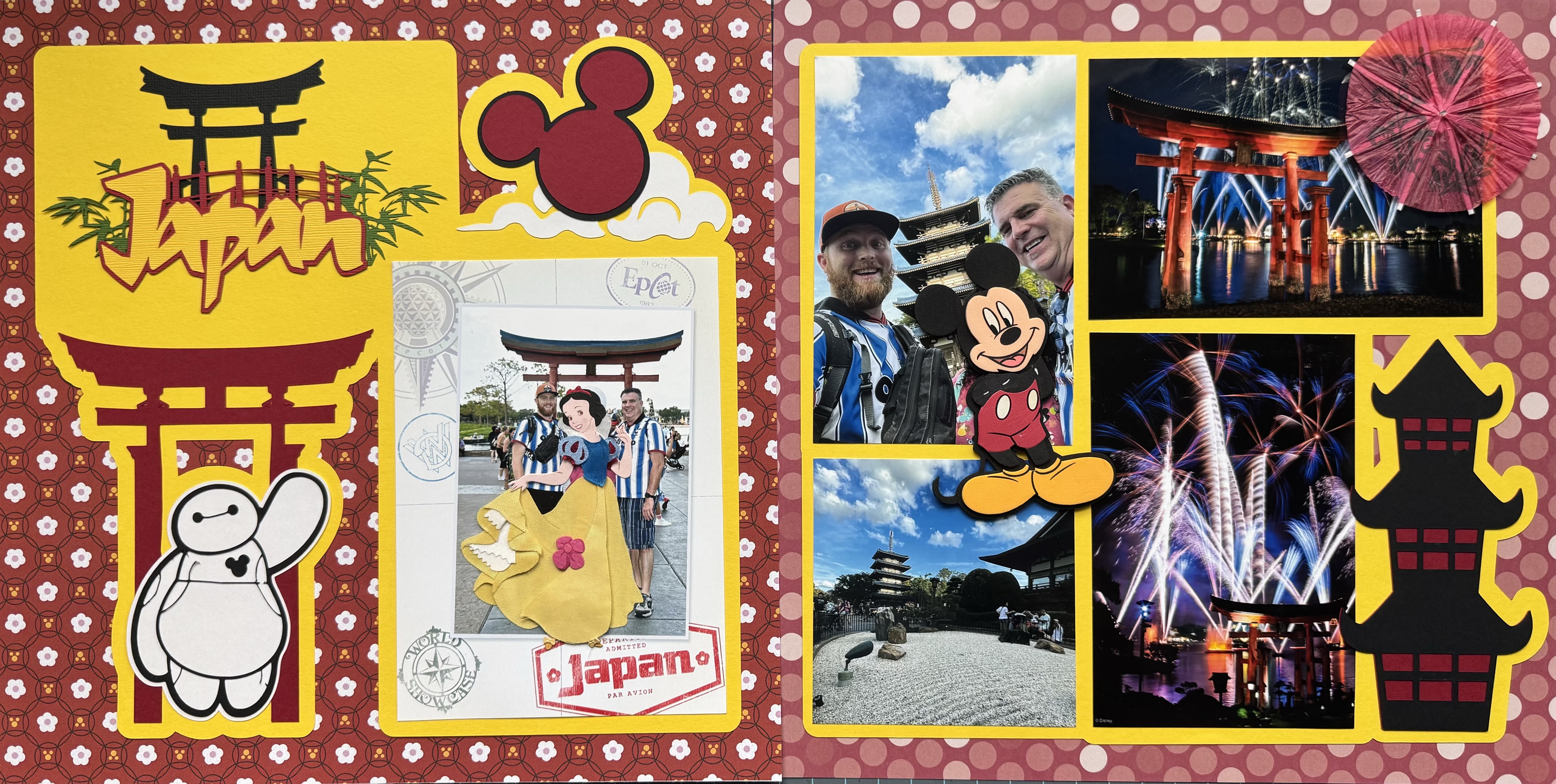 The right-hand page features two nighttime photos from our photo package, showing fireworks framed by the silhouettes of the Japan pavilion. I added a layered cut of a three-tiered pagoda, inspired by the one nestled in the Japan Pavilion’s courtyard, and anchored the page with a 3D foam Mickey sticker—strategically placed to block someone we didn’t want to highlight. As a final touch, I carefully deconstructed a paper drink umbrella from the pavilion and added it to the layout, a tiny but textured reminder of that special evening under the lantern-lit sky.