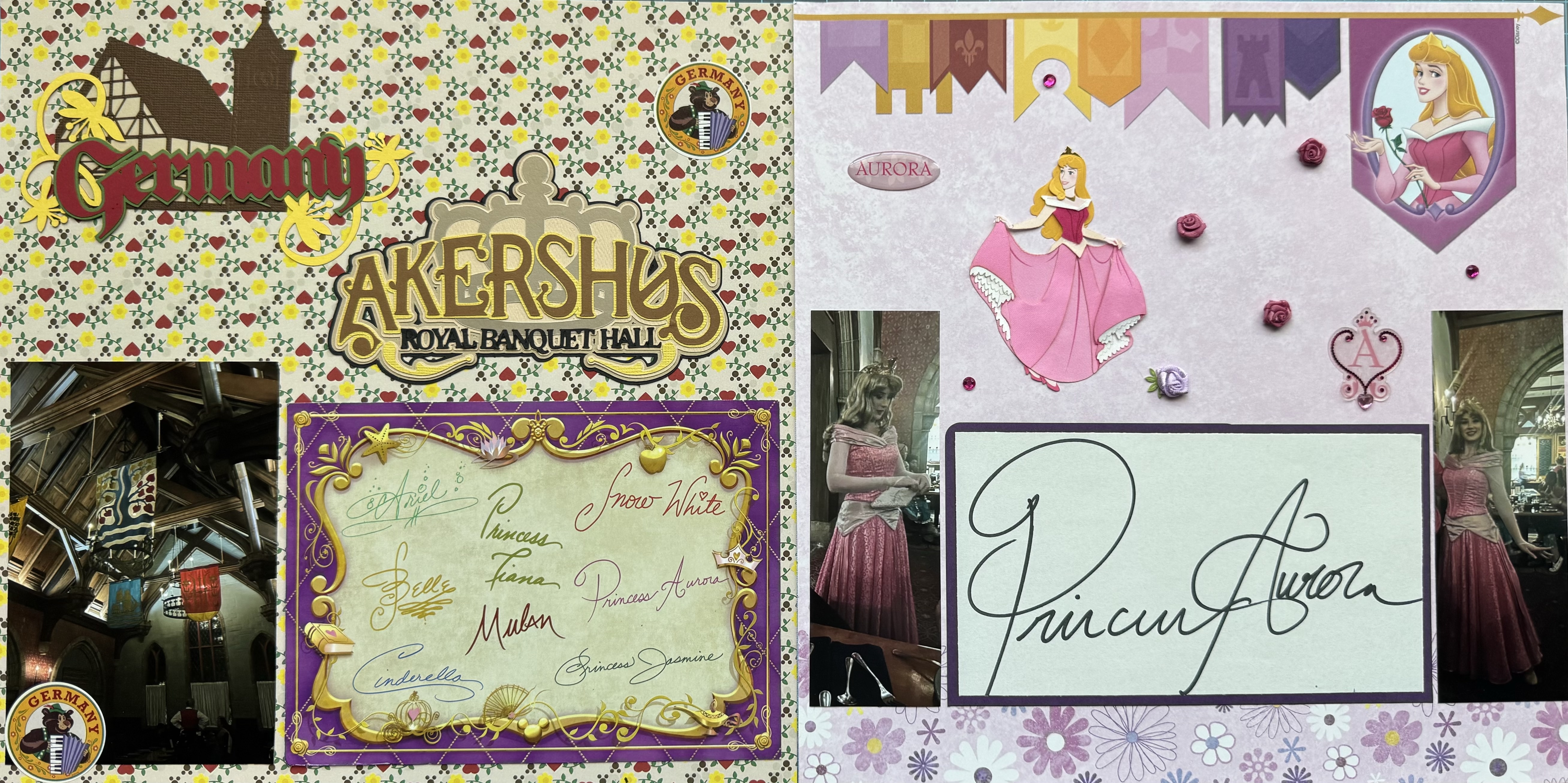 The “Germany” title block and background paper came from Scrapyourtrip.com (a bit of a mix-up thematically, but the colors worked well!), while I created the custom “Akershus Royal Banquet Hall” title using an SVG file I purchased on Etsy and cut with my Cricut machine. It was a detailed project, but I love how it turned out. Also featured on this page are a photo of the wooden rafters inside the hall and our invitation card, which includes signatures of the princesses who typically appear. You’ll also notice two collectible stickers in the corners—fun little tokens often given to children throughout the World Showcase.