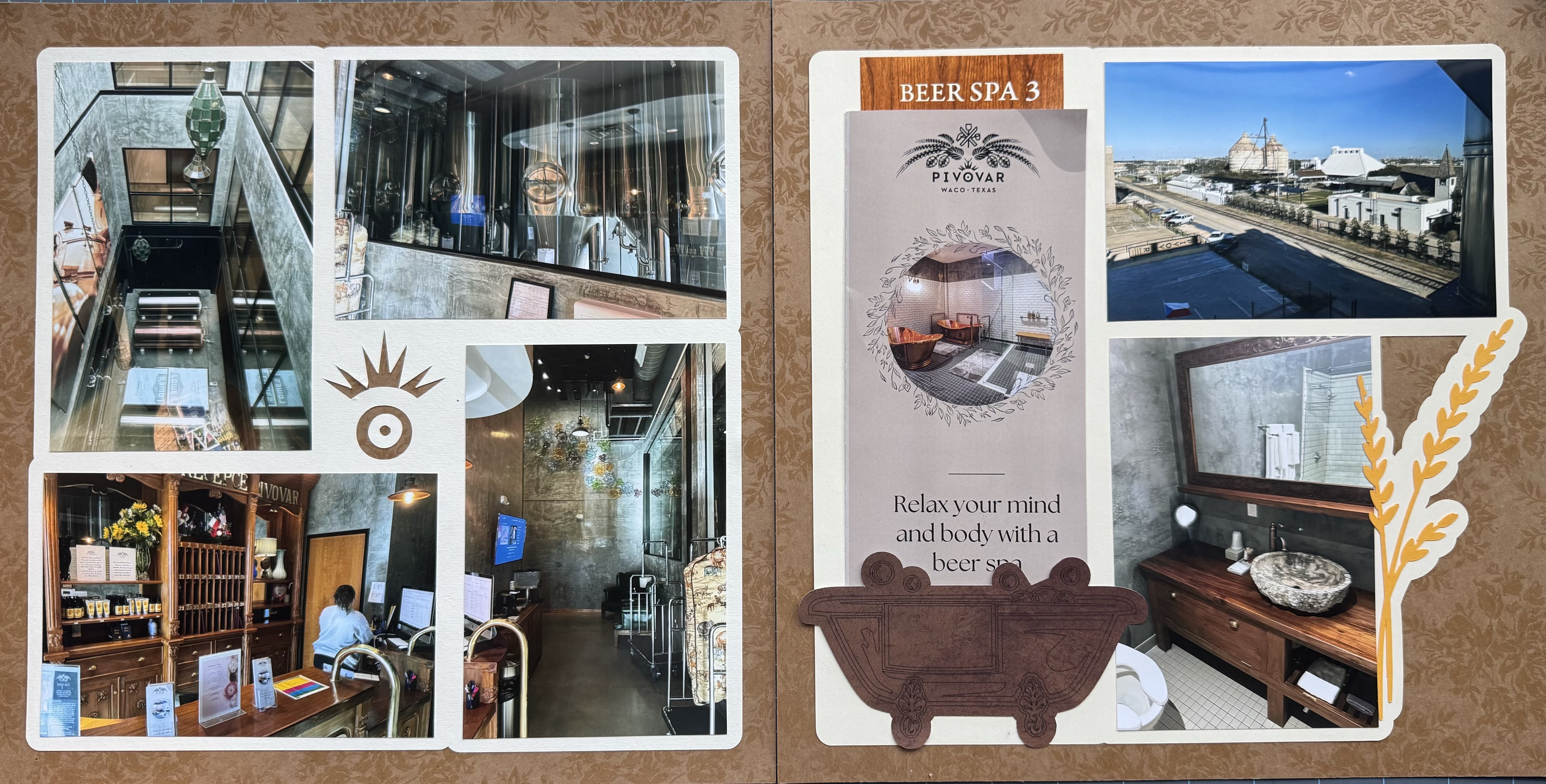 On the right-hand page, I tucked the beer spa brochure into a hidden pocket behind a Cricut pen-drawn tub—a fun, interactive detail for viewers to discover. The photos on that side include the sleek bathroom (which I loved so much I’m recreating it at home) and the view of the Magnolia Silos from my window. I finished off the page with a few wheat stalks, a subtle nod to the brewing process and the hotel’s Czech beer heritage.