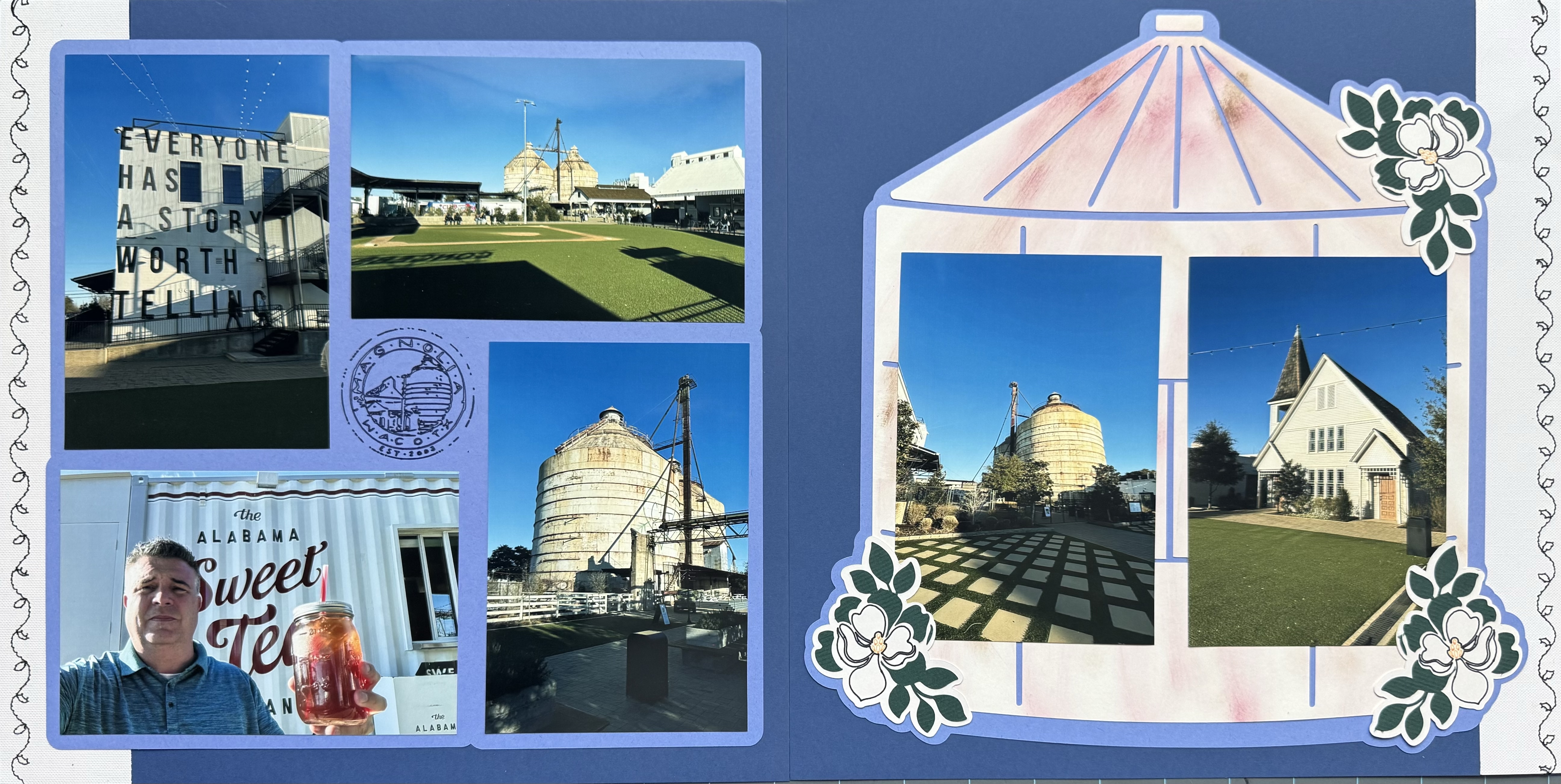 For this spread, I went with a soft blue and white theme to echo the colors from my visit to the Magnolia Silos—the bright Texas sky paired so beautifully with the crisp white buildings and those iconic silos. I added a white border on either side of the layout, and to bring in a little handcrafted charm, I stitched a simple vine pattern in black thread using my sewing machine. On the left-hand page, I arranged four photos of the Silos property in one of my go-to square grid layouts. In the center, there’s a Magnolia logo I imported and had my Cricut Maker draw with a pen—and I have to say, I just love how it turned out. I also included a photo of me enjoying an iced tea from the Alabama Sweet Tea Company, served in a Mason jar, of course—because it’s those little touches that make a memory stick.