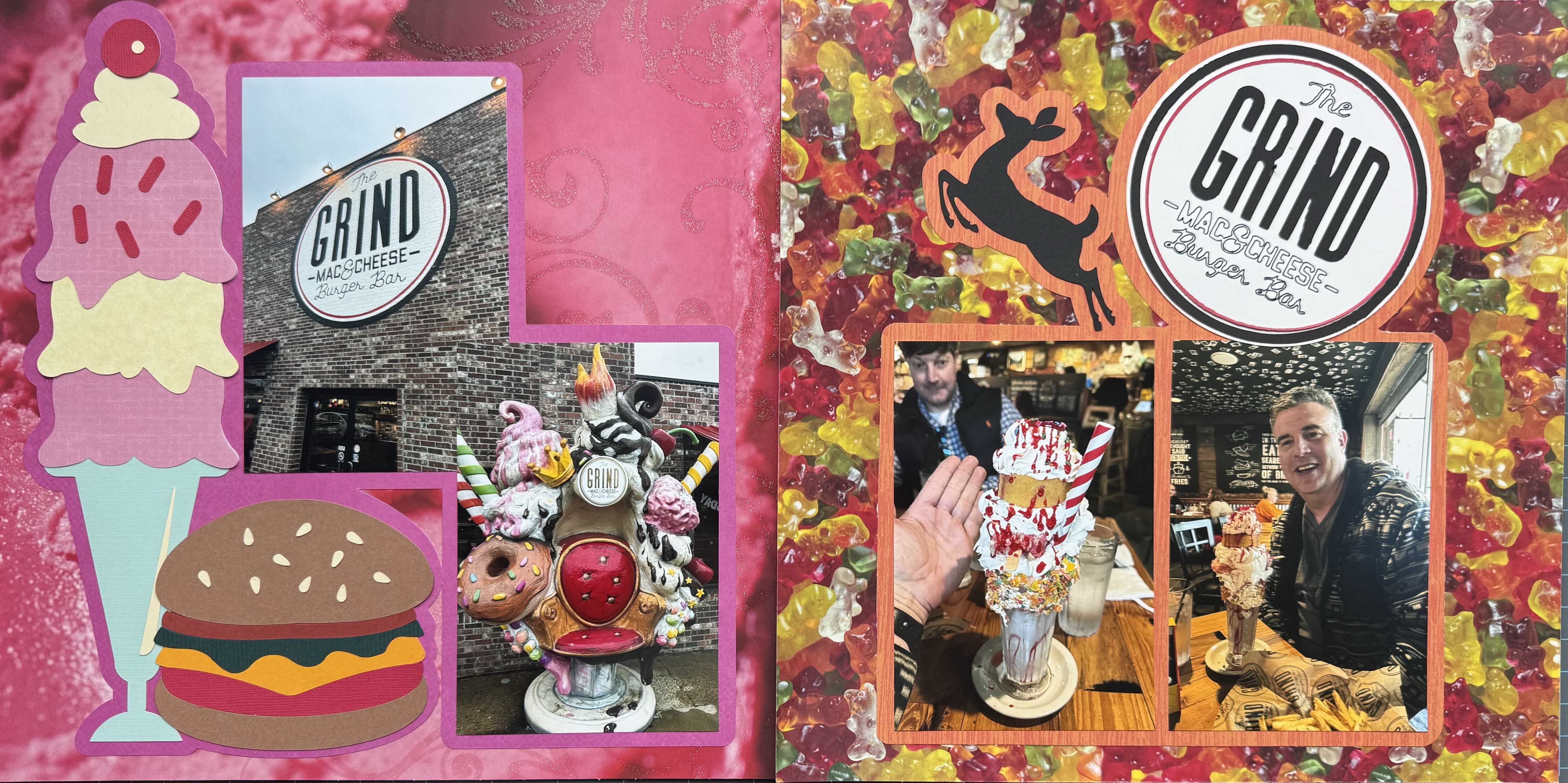 This is the only layout from that trip, and it’s the cherry on top—proof of just how sweet and memorable the experience was. I went all-in with ice cream and candy-themed background cardstock to capture the sugar-rush spirit of The Grind, where the desserts were truly larger than life. On the left-hand page, I featured a jumbo ice cream sundae and a towering burger, representing the sundae-best meal we had. There are also two photos of the restaurant’s exterior—one of the colorful sign and the other of an outrageous milkshake sculpture that’s every bit as shake-tacular as the real thing. I designed all the elements in Cricut Design Space and cut them out using my Cricut Maker, layering the sweetness like a triple-scoop cone.