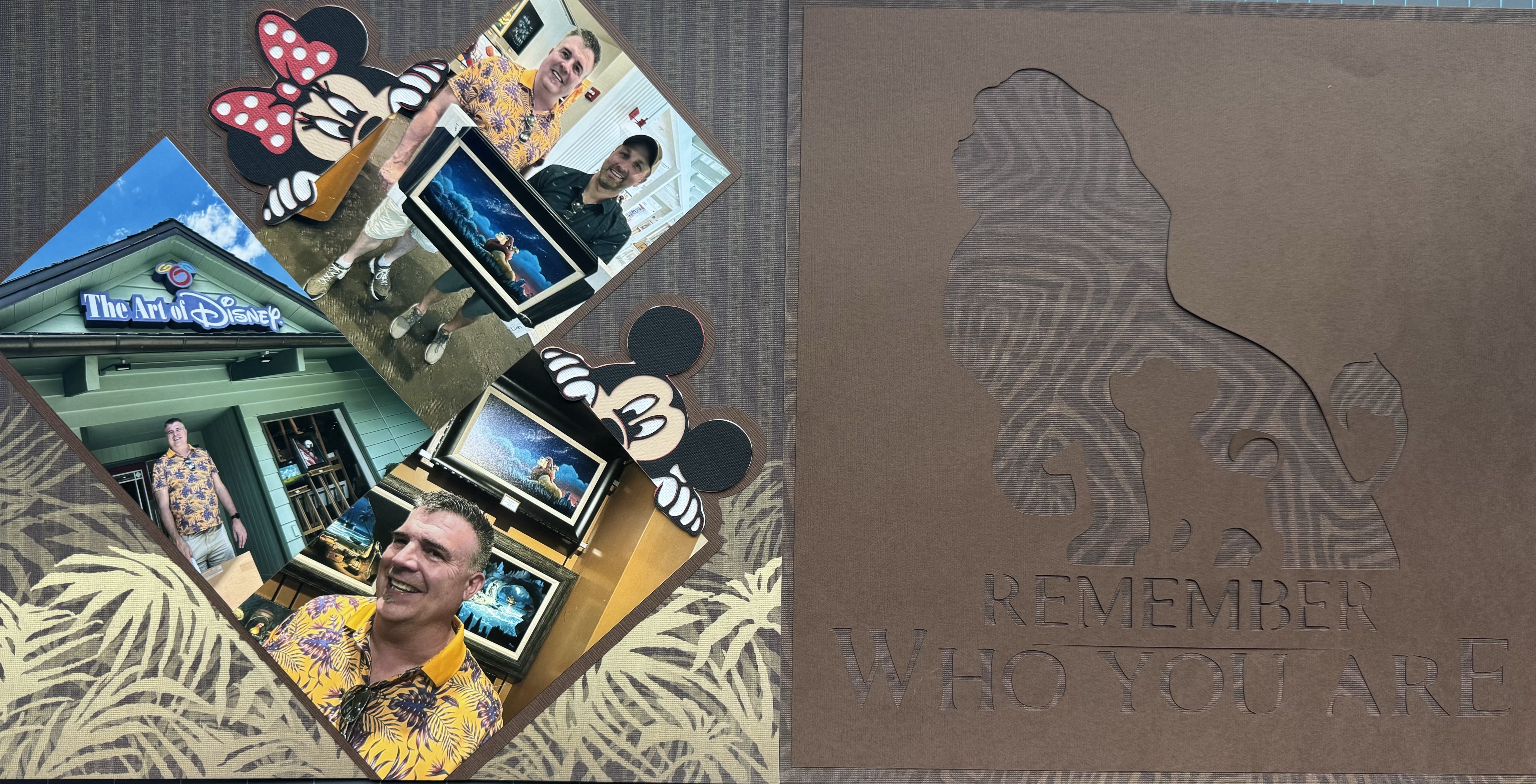 As a finishing touch, I added two peek-a-boo SVG cuts of Mickey and Minnie Mouse, who look like they’re peeking over the photos, just like Zazu keeping an eye on the savanna. It’s playful, personal, and perfectly Disney.