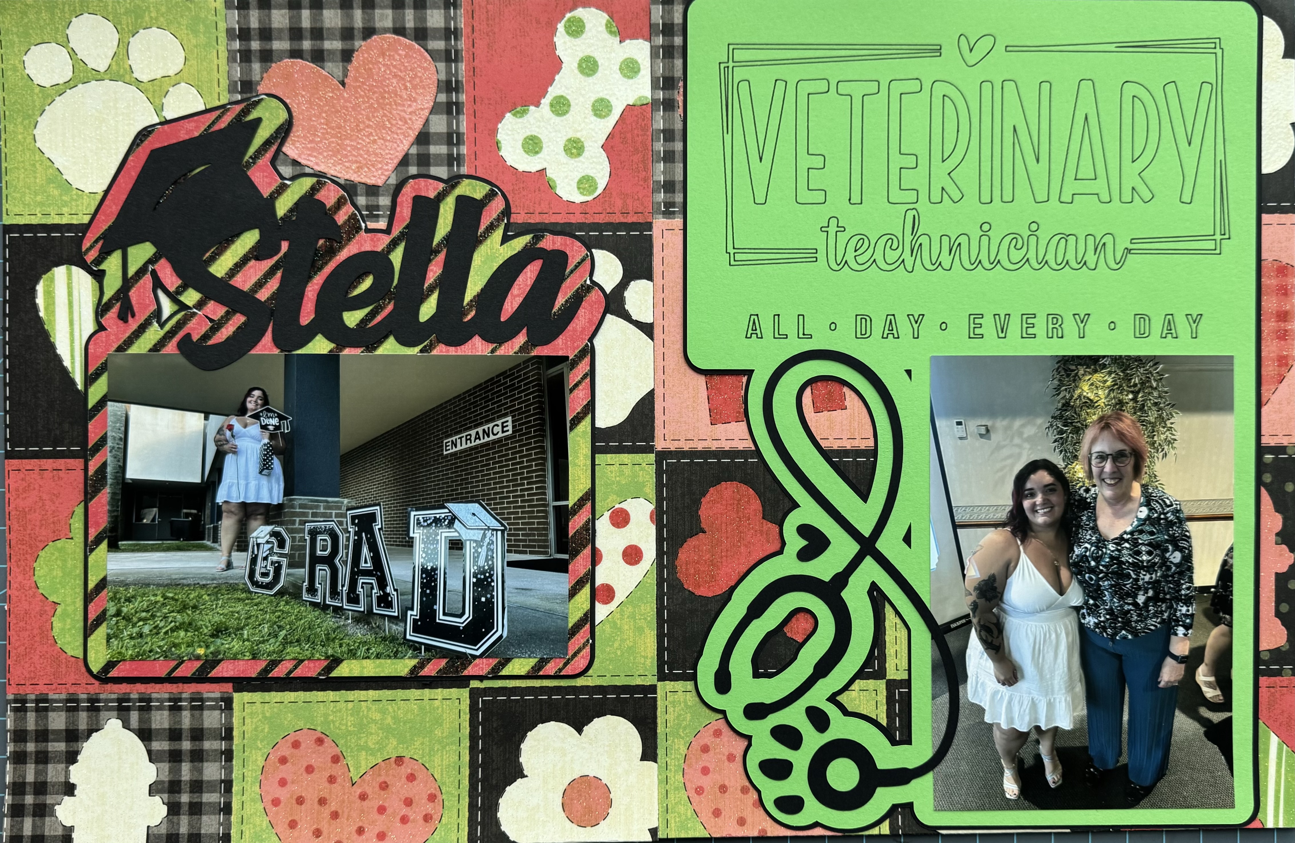 Everything on this layout was designed using Cricut Design Space and brought to life with my Cricut Maker, which handled both the cutting and drawing features like a champ. On the left-hand page, I created a custom “Stella” title block featuring a silhouette of a graduate cap and gown—because every doggone good party needs a statement piece! On the right-hand page, I used the pen tool to carefully draw out a veterinary technician graphic.