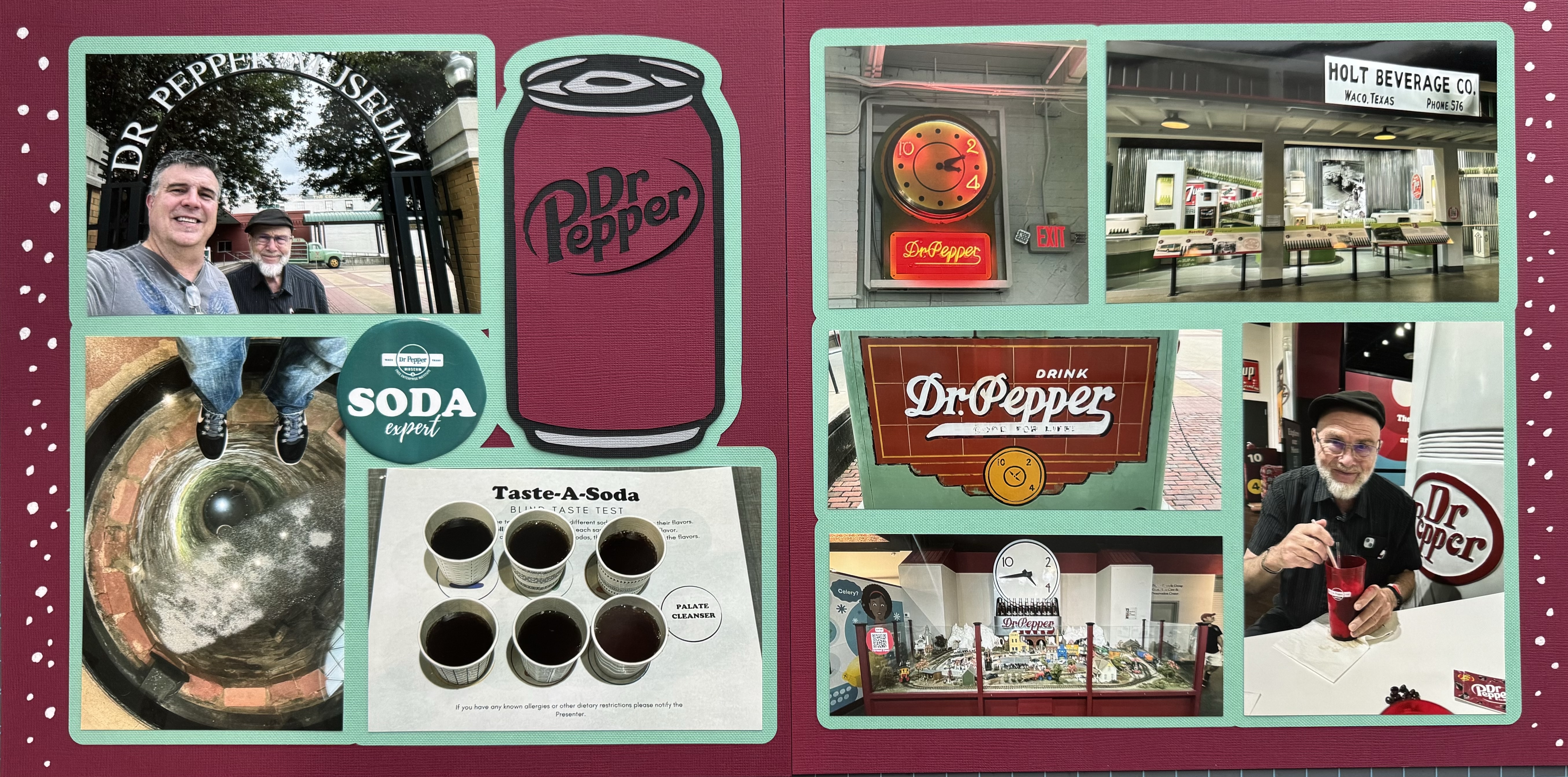 This scrapbook spread captures a truly refreshing memory – my first visit with my dad to the Dr Pepper Museum in Waco, Texas. If you’ve never been, the museum is a fizzy tribute to America’s oldest major soft drink, created in Waco in the 1880s. Housed in a historic bottling plant, it’s packed with vintage memorabilia, interactive exhibits, and soda fountain treats that’ll transport you back in time – one sip at a time.