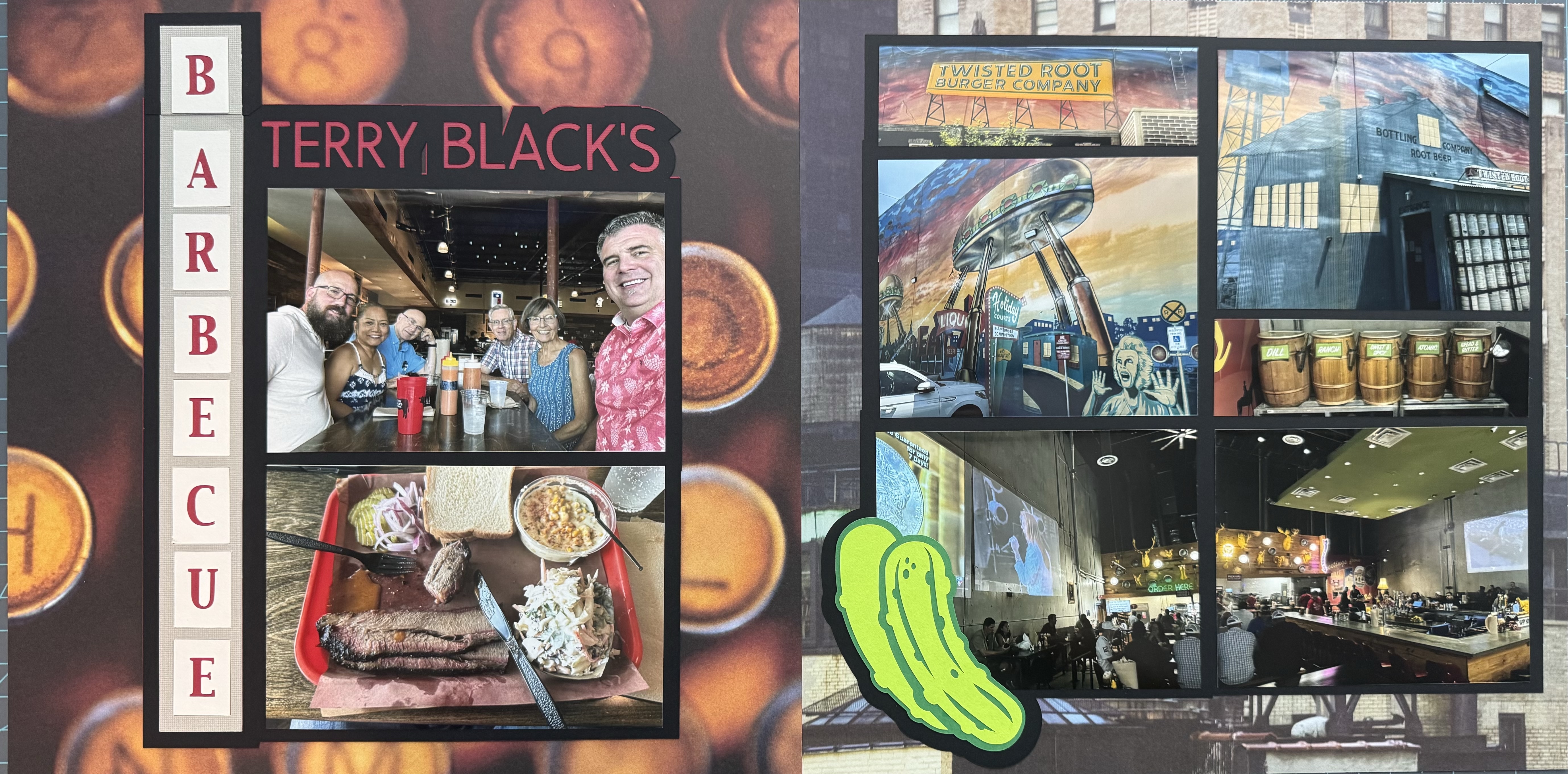 The left-hand page celebrates our visit to Terry Black’s Barbecue, one of Texas’ most famous barbecue names. Originally rooted in Lockhart—often called the “Barbecue Capital of Texas”—Terry Black’s brings that same slow-smoked tradition to Waco with mouthwatering brisket, ribs, and sausage. My mom’s sister and her husband came to help us unpack after our move here, and my cousin and his wife joined us for a day. We decided this called for a Texas-sized meal, so off we went to Terry Black’s. This page features a family photo and, of course, a shot of my plate piled high with smoky, tender barbecue. I chose a background paper printed with photographic typewriter keys to capture the restaurant’s industrial and rustic vibe. The layout was designed in Cricut Design Space and cut with my Cricut Maker. Fun fact—I accidentally misspelled “Barbecue” at first, but I managed to fix it (you can watch exactly how in the video below).