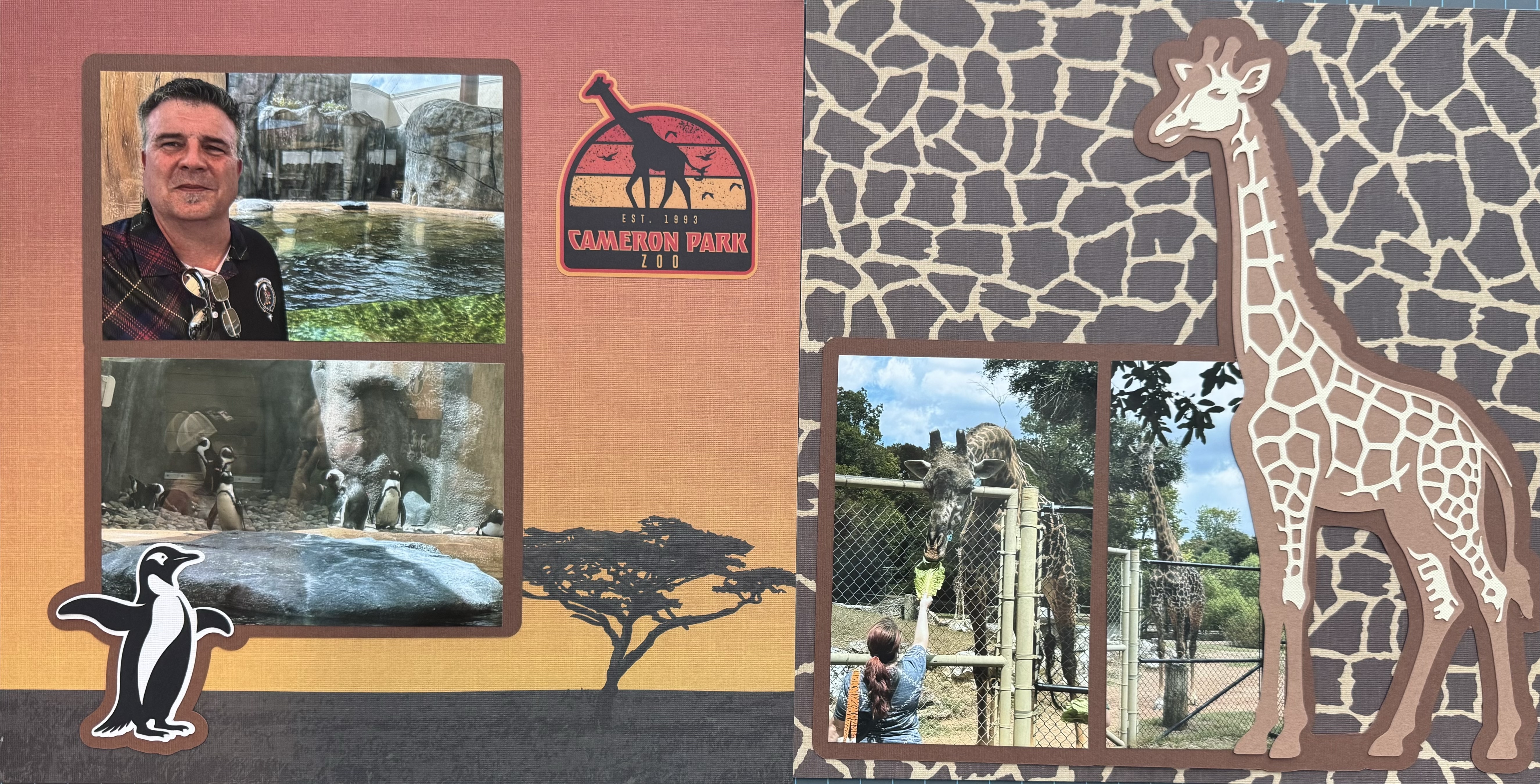 The right-hand page belongs to the gentle giant of the savanna—the giraffe. One of my colleagues can be seen feeding it, a moment of quiet connection between species. Behind the images, giraffe-patterned cardstock stretches like the dappled skin of the animal itself. And at the forefront, a paper-cut giraffe—crafted with my Cricut Maker—stands tall, completing the scene.